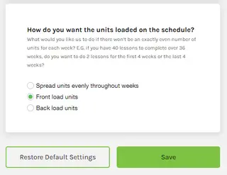 This screen is also the place to mark any courses you'd prefer not to spread evenly throughout your year. For instance, we often suggest first-graders save 6-Trait Writing for the last 25 weeks of the year in first grade to gain more reading competency before adding writing. So for that course, you'd want to select "backloading," e.g., loading the course to the back of his list. Alternatively, you may wish to finish science early so that you can free up your spring for nature walks. In that case, frontload the science course so that you'll do one a week until the lessons run out.